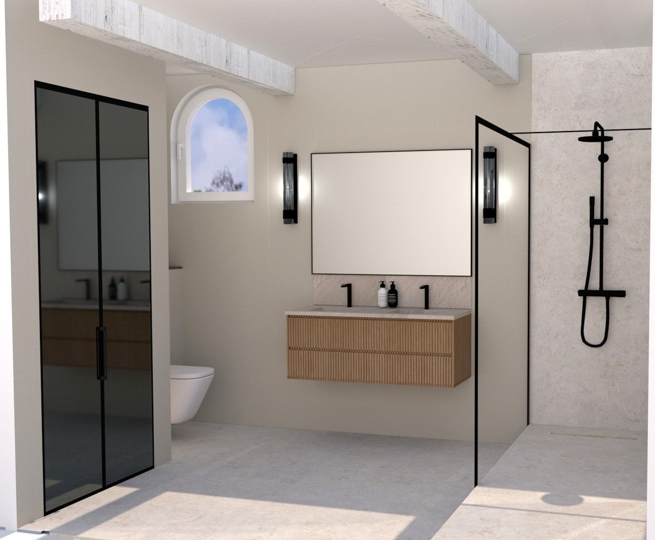 - Disposition fluide avec zones définies pour douche, lavabo et WC.
